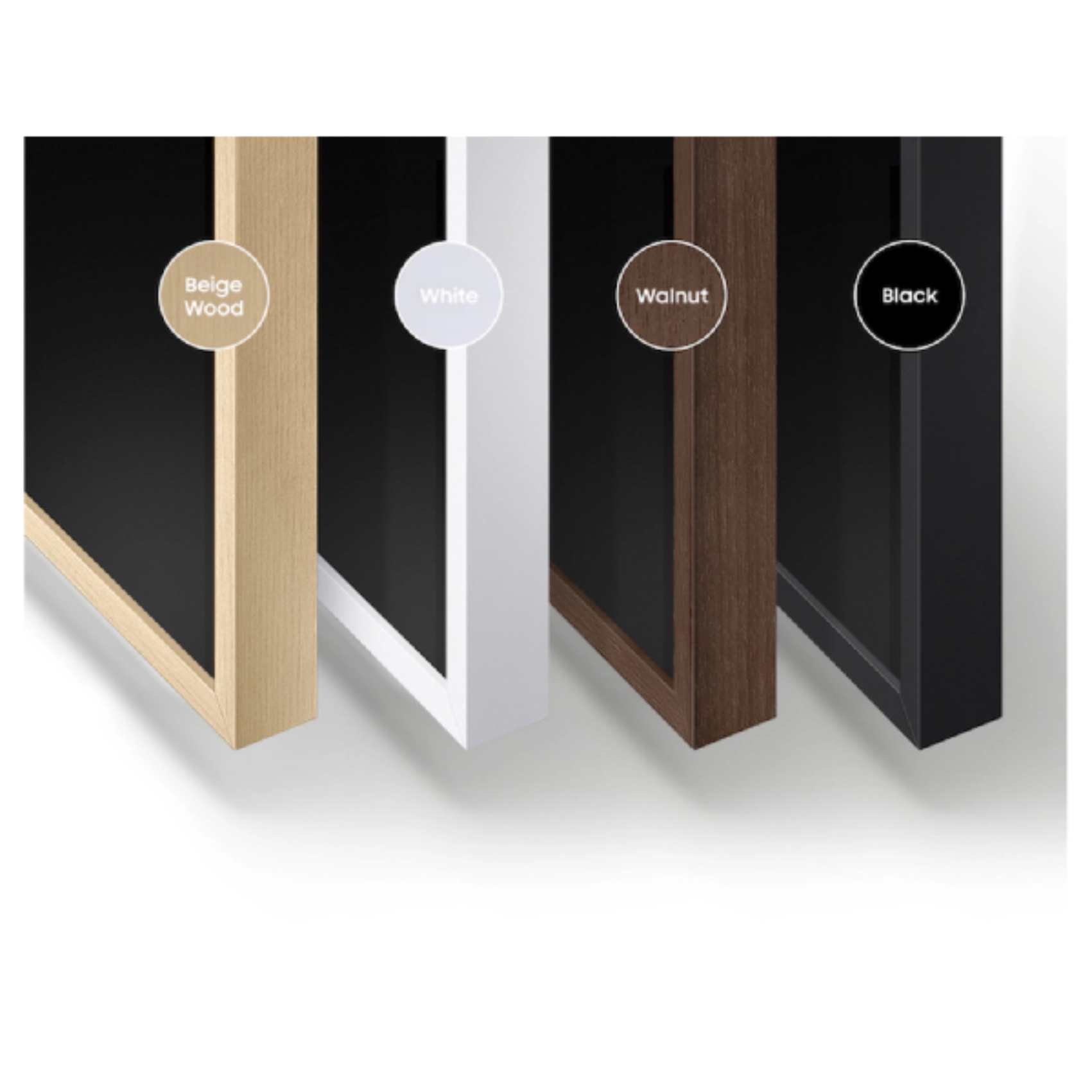 The 65" The Frame Customizable Bezel in walnut/dark wood is an elegant and functional accessory designed to enhance the look of Samsung’s The Frame TV. Known for its ability to transform into a beautiful piece of art in Art Mode, The Frame TV is already a unique blend of technology and design. The walnut/dark wood bezel further elevates this aesthetic, adding a rich, sophisticated look that resembles a traditional picture frame. This bezel allows users to seamlessly integrate The Frame TV into their home décor, making it an ideal choice for those who want their TV to blend with the surrounding design elements.