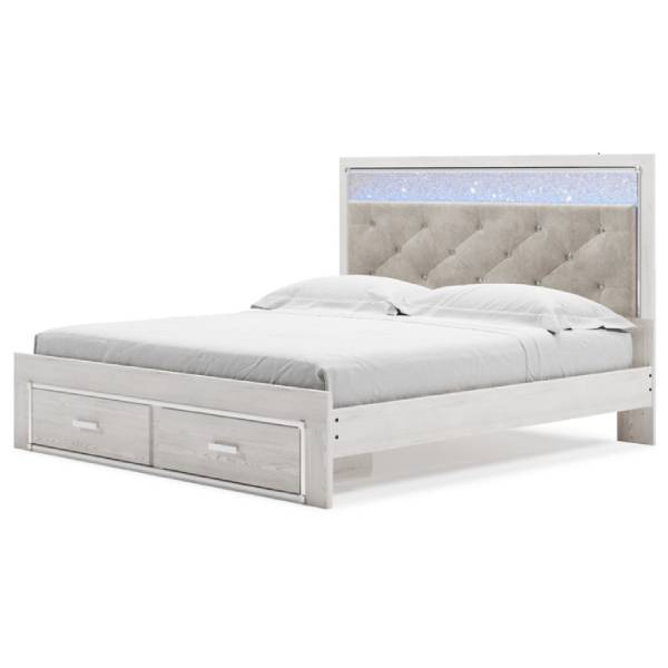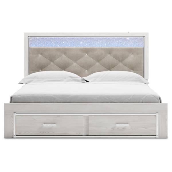 The Altyra King Upholstered Storage Bed, exclusively available at Teletime, redefines bedroom luxury with its fashion-forward design and unparalleled functionality. This stunning bed combines modern elegance with practical features, creating the ultimate retreat for relaxation. Its pearlized finish and shiny chrome-tone accents provide a sophisticated touch, while the button-tufted upholstered headboard, adorned with faux crystal accents, adds a layer of opulence to its rustic charm.