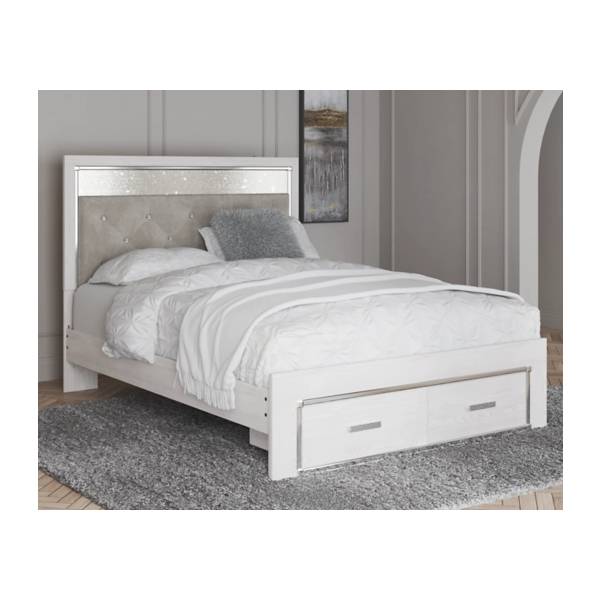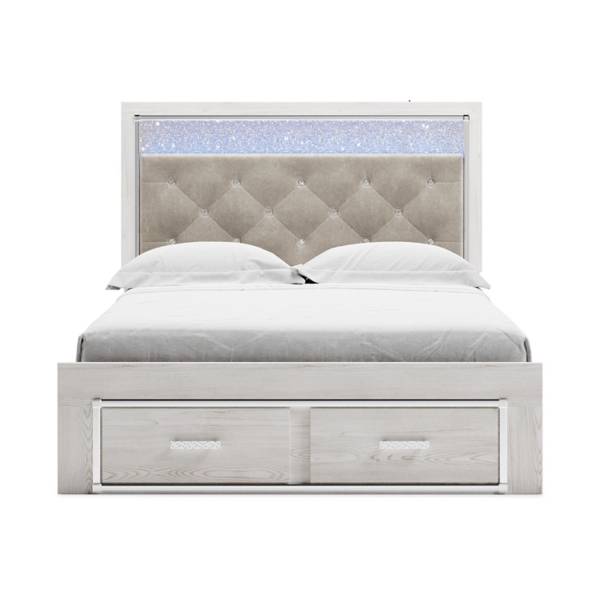 The Altyra Queen Upholstered Storage Bed, available at Teletime, is a masterpiece of modern elegance and luxurious design. Perfectly blending comfort with sophistication, this bed brings a touch of glam to your bedroom. Featuring a pearlized finish and shiny chrome-tone accents, it offers a chic, fashion-forward aesthetic. The button-tufted upholstered headboard, adorned with faux crystal accents, exudes a lavish appeal, while the LED lighting provides an innovative and stylish touch, allowing you to create the perfect ambiance with a remote-controlled color and brightness adjustment system.