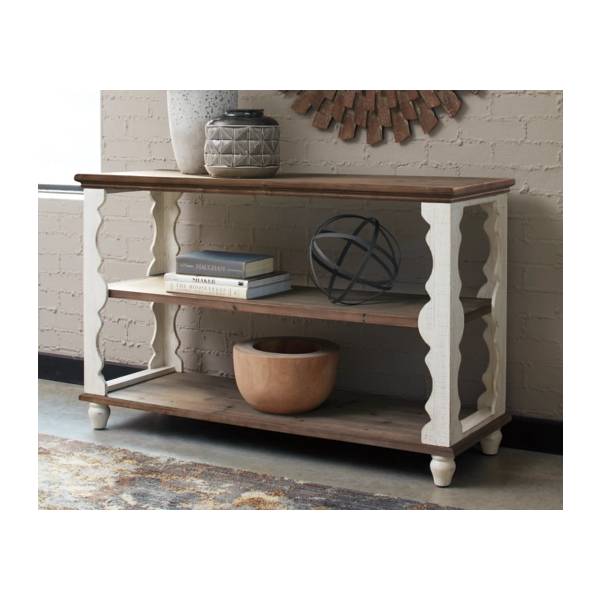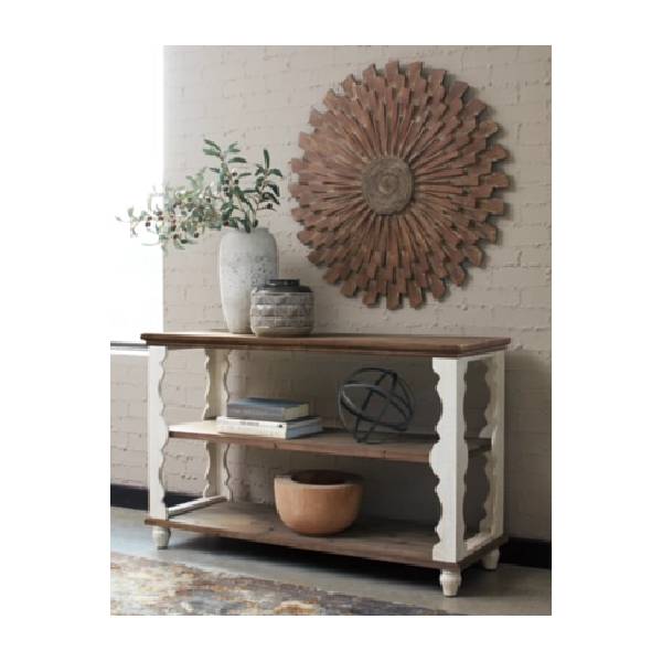 This console sofa table blends minimalist charm with natural knotty wood, antiqued white accents, and unique scalloped woodwork, offering both style and practical storage with two fixed shelves.
