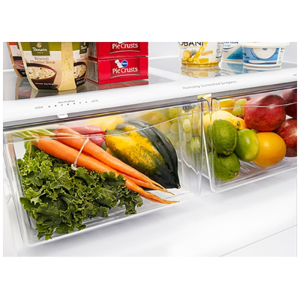Humidity-controlled crispers help prolong the freshness of fruits and vegetables. A deli drawer is perfect for storing cold cuts and cheeses. The reversible door hinge allows for flexible installation options to suit your kitchen layout.