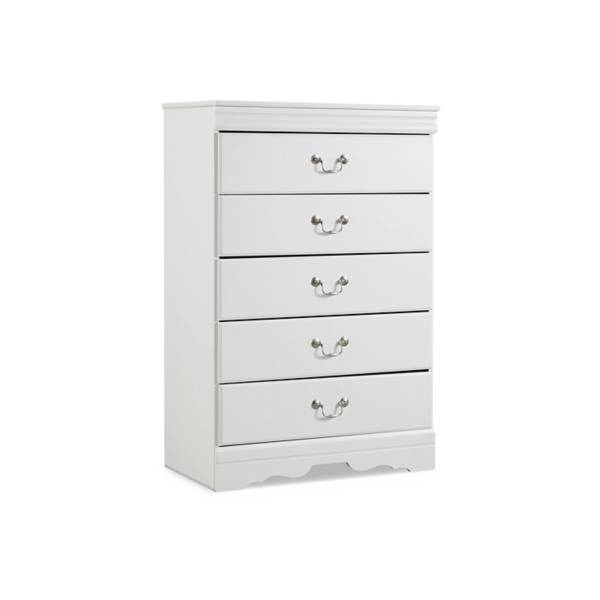 The Anarasia Five-Drawer Chest brings timeless elegance to your bedroom with its charming cottage-inspired design and sophisticated detailing. The crisp white finish gives a refreshing twist to the traditional Louis Philippe style, making it a graceful addition to both classic and modern interiors. Its refined silhouette and decorative antiqued pewter-tone bail pulls enhance the aesthetic, exuding understated elegance.