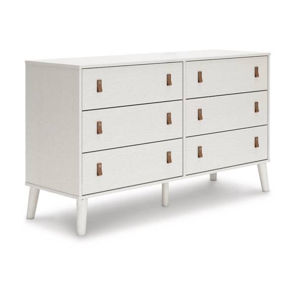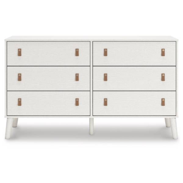 Embrace modern minimalism with the Aprilyn Six Drawer Dresser, available exclusively at Teletime. This sleek and contemporary piece captivates with its clean lines and streamlined silhouette, perfectly complemented by a white painted finish that subtly reveals a delicate wood grain texture. Its effortlessly chic design brings a fresh, airy feel to any bedroom, making it a versatile choice for contemporary and minimalist interiors alike.