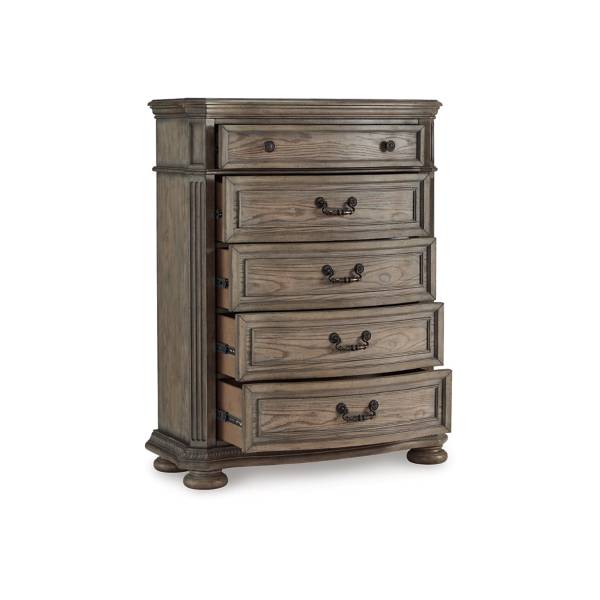 Equipped with five spacious drawers, this chest provides ample storage for your essentials. Each drawer boasts a fully finished interior, dovetail construction for added strength, and heavy-duty ball-bearing side glides for smooth operation. The top drawer is felt-lined, offering a soft space for delicate items. With its aged bronze-tone metal hardware, the Ardenfield Five Drawer Chest adds a final touch of sophistication to your bedroom. Exclusively available at Teletime, this piece is a blend of stunning design and practical elegance.