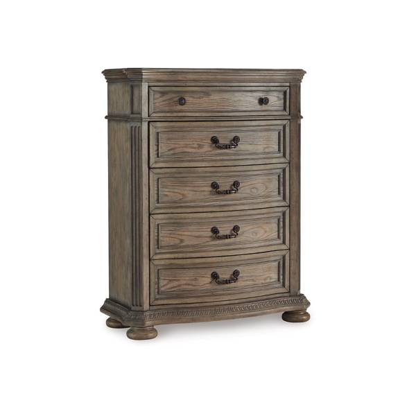 The Ardenfield Five Drawer Chest effortlessly combines traditional elegance with modern comfort, elevating your bedroom into a sophisticated retreat. Its serpentine curves and ash swirl veneer inlays create an eye-catching design, while the glazed antiqued-look finish exudes timeless charm. This chest is more than just a storage solution; it's a statement piece that radiates refinement and class.