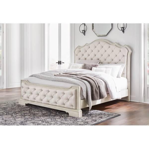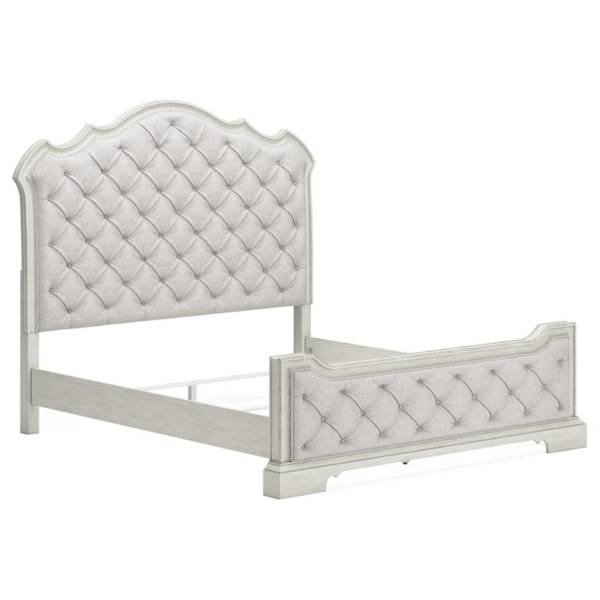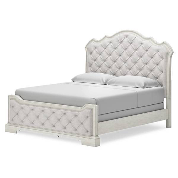 The Arlendyne California King Upholstered Bed introduces an air of timeless romance and elegance to your bedroom retreat. Its antiqued white painted finish, paired with a serpentine-shaped silhouette, creates an effortlessly refined aesthetic that evokes both charm and sophistication. Designed to impress, this bed exudes luxury from every angle with its decadent button-tufted cushioning that extends from head to toe.
