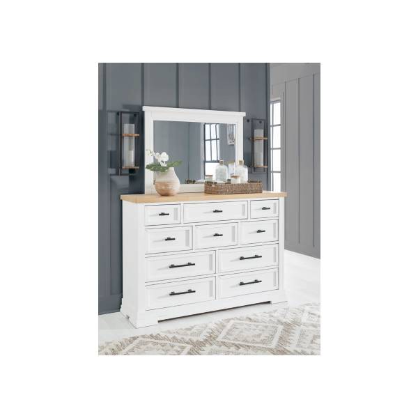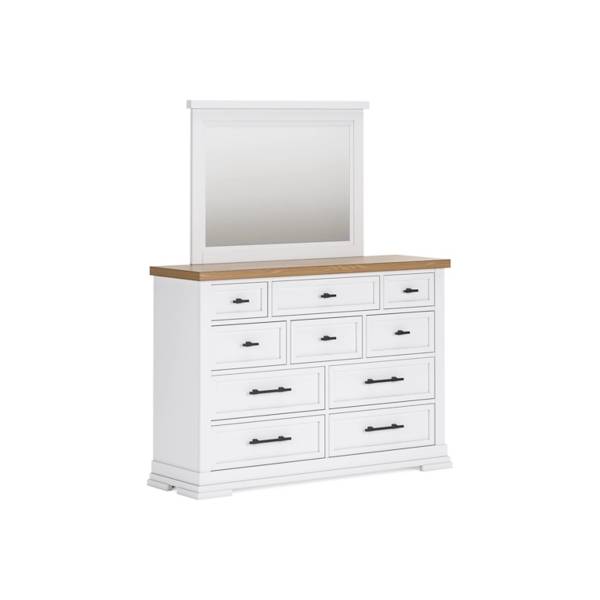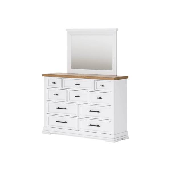 Bring timeless charm and casual sophistication to your bedroom with the Ashbryn Dresser and Mirror, available at Teletime. Designed with a modern farmhouse influence, this beautifully crafted set features a clean two-tone look—combining a classic white finish with a natural butcher block oak veneer top for added warmth and character.
