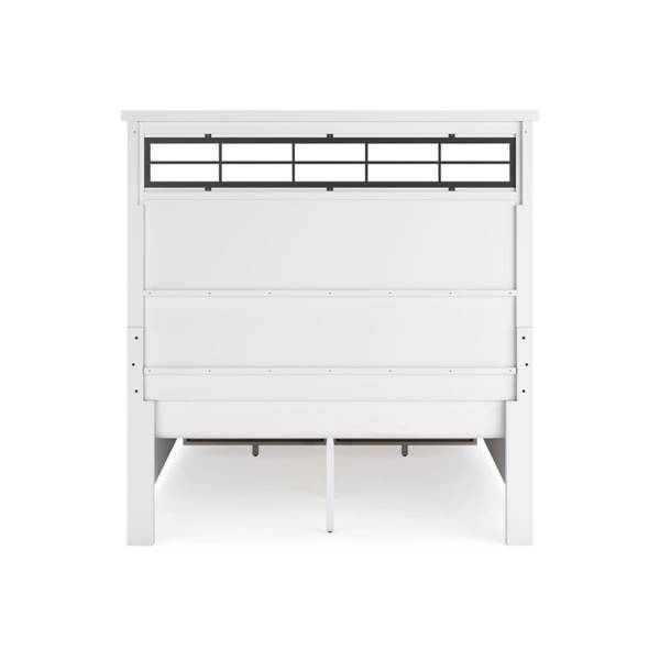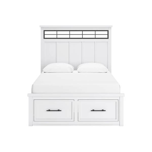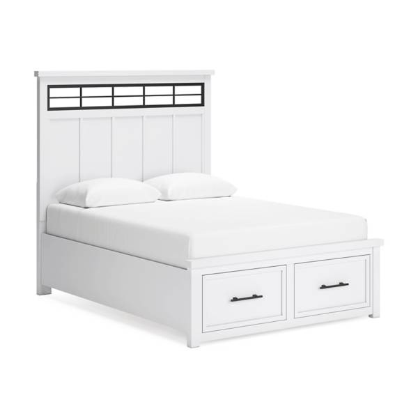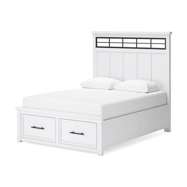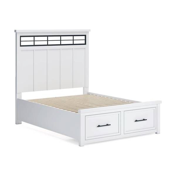 Introduce casual elegance and practicality to your bedroom with the Ashbryn Queen Panel Storage Bed. This bed combines modern farmhouse design with thoughtful storage solutions, making it a perfect centerpiece for your cozy sanctuary. The headboard features an inset black metal barn sash detail, adding a touch of rustic sophistication to its classic silhouette. The white finish enhances the bed’s understated charm, creating a calming and inviting ambiance.