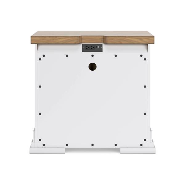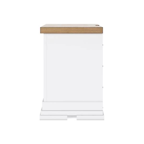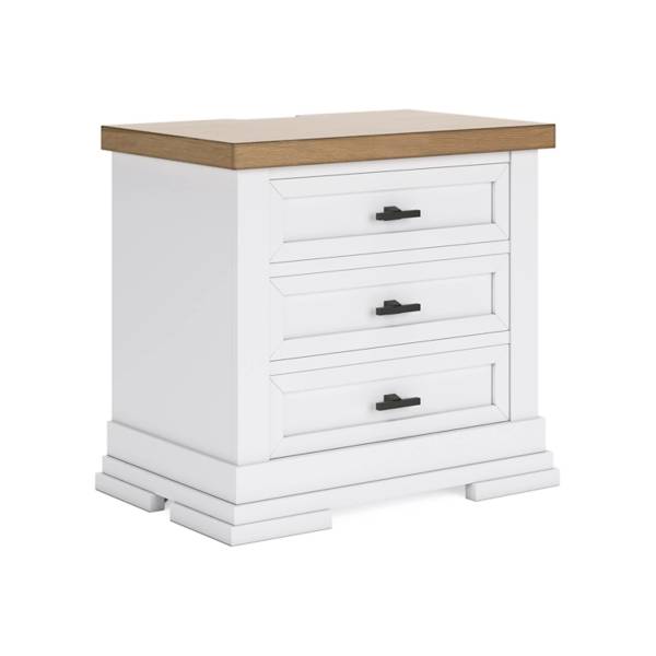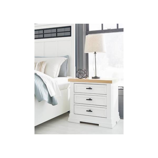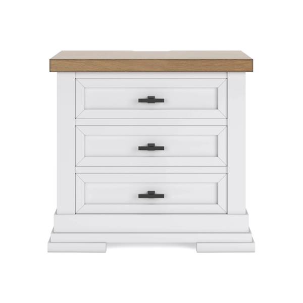 Bring casual elegance and practical functionality into your bedroom with the Ashbryn Three Drawer Nightstand, available exclusively at Teletime. Designed to blend classic farmhouse charm with modern convenience, this nightstand features a striking two-tone finish—crisp white paired with a natural butcher block oak veneer top—that instantly elevates any space with warmth and character.