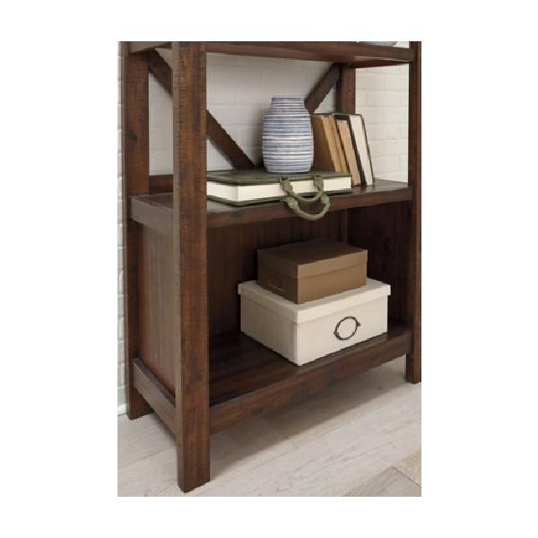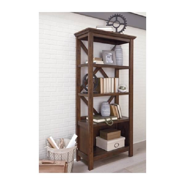 A stylish bookcase with a rustic, warm brown finish and distinctive saw mark distressing. Features a clean-lined profile, crossbuck back, and four shelves (two adjustable). Perfect for a casually cool, industrial look.