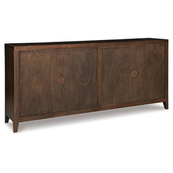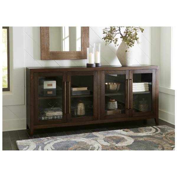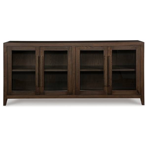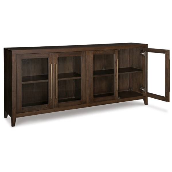 Add a touch of sophistication to your space with this chic accent cabinet. The dark brown finish is both neutral and refined, while antiqued brass-tone hardware introduces a hint of glamour. Glass door fronts and a light wire-brushed effect enhance its modern appeal.