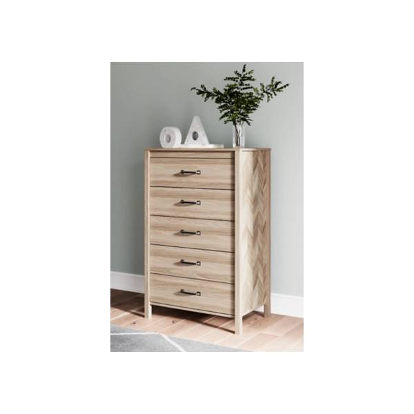 Create a serene and stylish retreat with the Battelle Five Drawer Chest, available at Teletime. Showcasing a striking combination of a dry, light oak grain finish and a distinctive chevron pattern, this chest brings a refined touch of mid-century modern elegance to your bedroom decor.