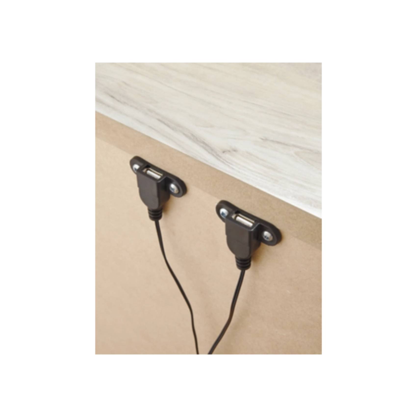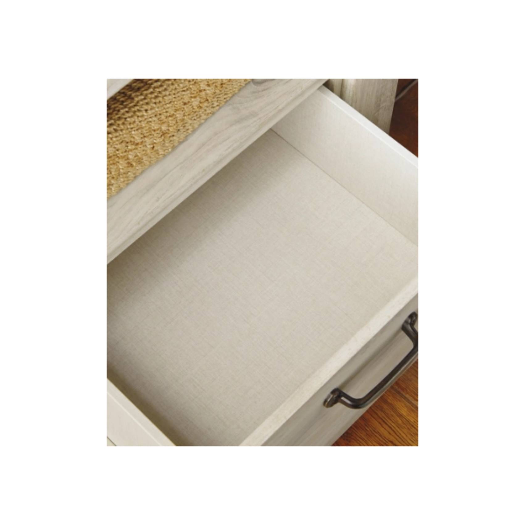 Infuse your bedroom with the inviting warmth of farmhouse charm with the Bellaby One Drawer Night Stand, now available at Teletime. Showcasing a soft wispy white finish over a replicated oak wood grain, this nightstand brings a fresh, airy feel to your space while maintaining a rustic, authentic look. The clean-lined design is enhanced with brushed nickel-tone hardware accented by black edging, adding a subtle touch of elegance. A smooth-gliding drawer lined with faux linen laminate keeps your essentials neatly tucked away, while the open cubby below offers added storage or display space. Designed for modern living, this stylish piece also features a built-in slim-profile USB charging station to keep your devices powered at your bedside. Crafted from durable engineered wood with decorative laminate, the Bellaby nightstand perfectly blends form and function. Elevate your bedroom’s character with this beautiful piece—only at Teletime, where timeless design meets everyday practicality.