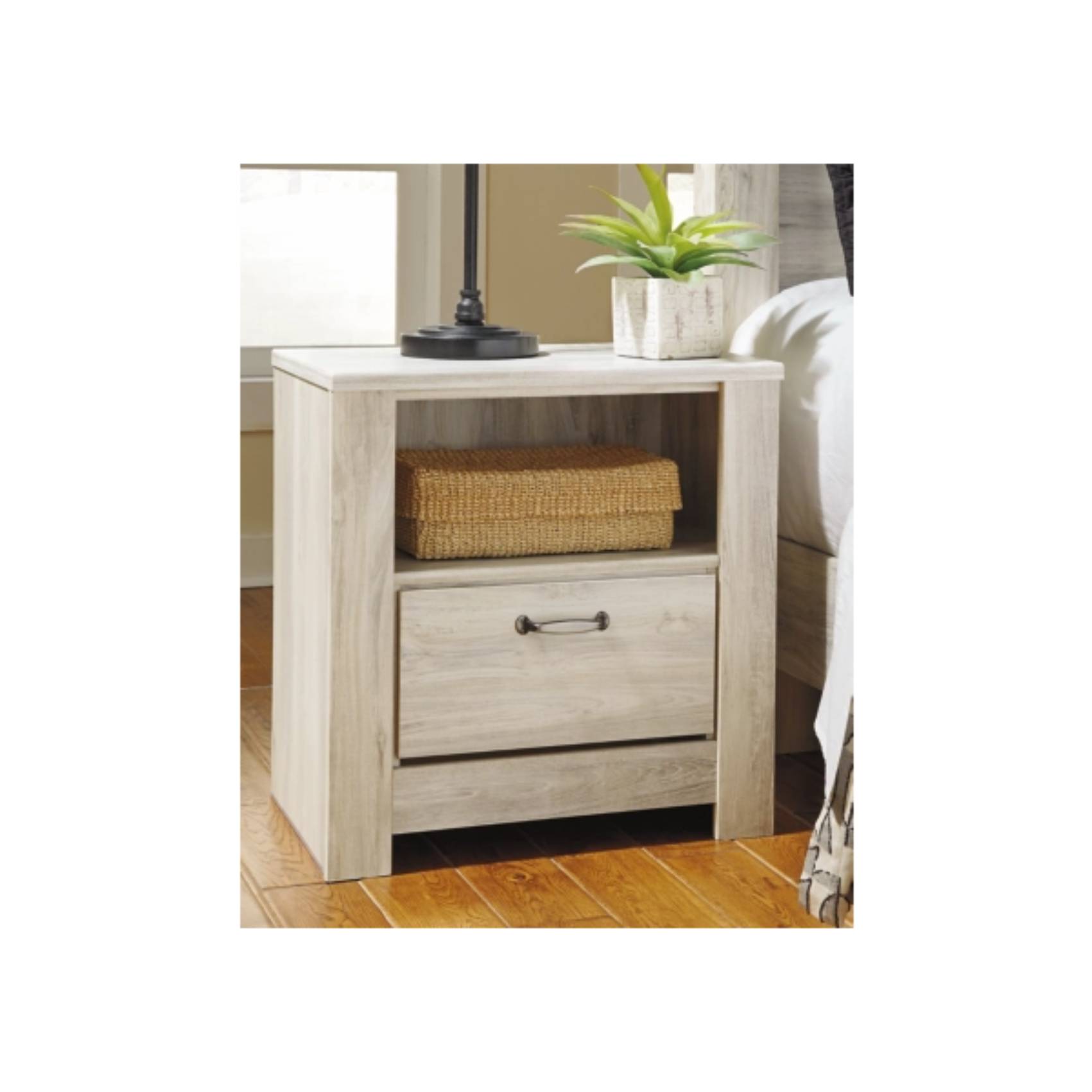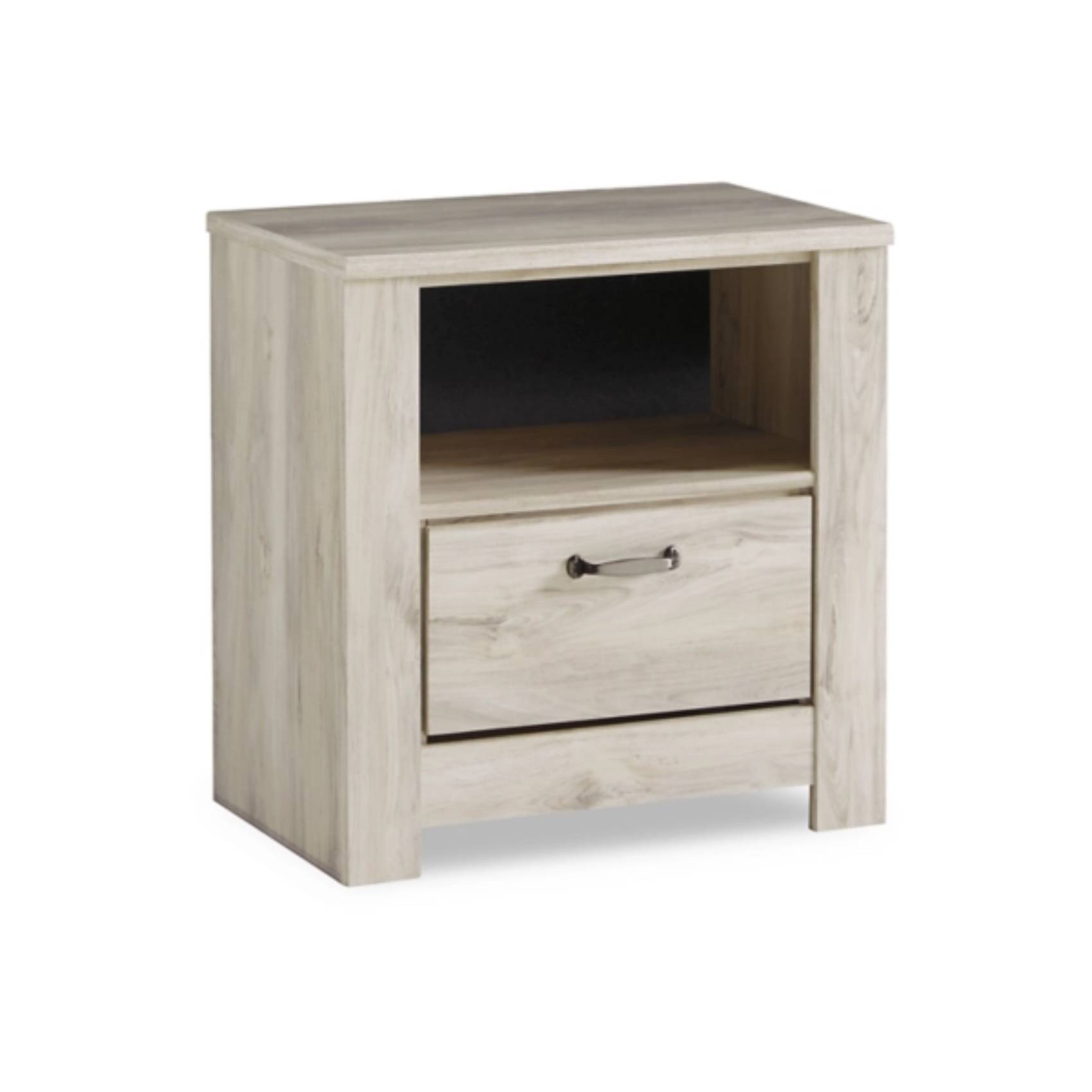 The Bellaby One Drawer Night Stand combines rustic character with a modern flair, enhanced by its whitewashed finish.Its compact design includes a smooth-gliding drawer and open shelf for convenient storage.A perfect blend of style and function to elevate your bedroom setting.