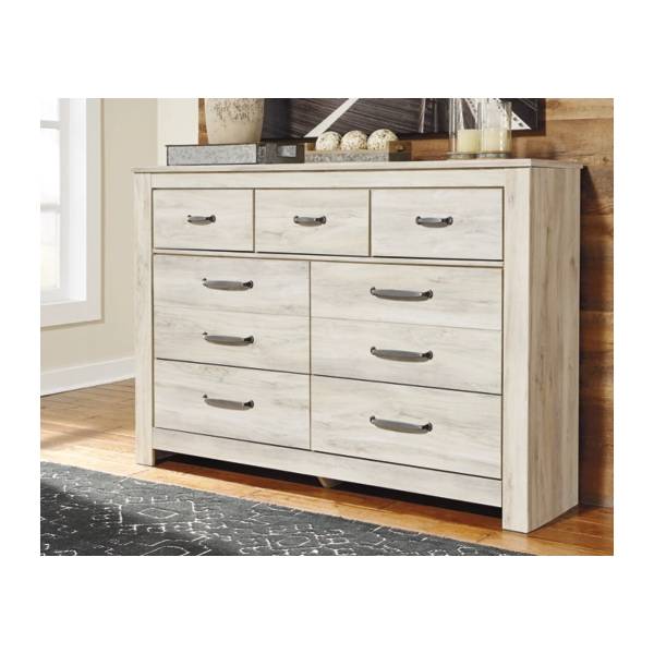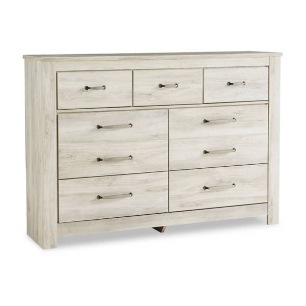 The Bellaby Seven Drawer Dresser is the perfect foundation for a farmhouse-inspired bedroom. Its wispy white finish over replicated oak grain brings a touch of charm and brightness to your space. The brushed nickel-tone handles, accented with black edging, add a subtle shine that enhances the dresser's appeal. Spacious drawers lined with faux linen laminate ensure your belongings are stored with care and elegance. This clean-lined, authentic piece serves as an inviting base for any décor style.