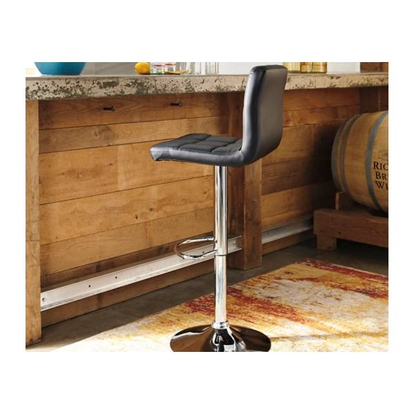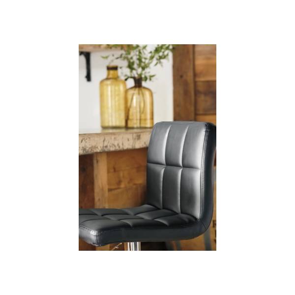 The Bellatier Tall Upholstered Swivel Barstool features a 360-degree swivel function, allowing for easy movement. Its adjustable height mechanism enables seamless transition between counter and pub heights. The upholstered seat and backrest, covered in black faux leather, provide both comfort and style.