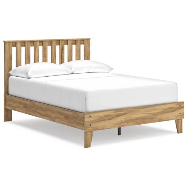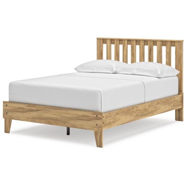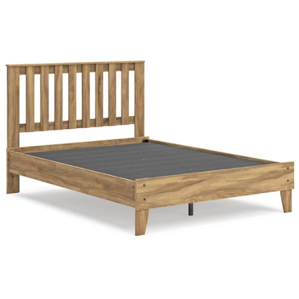 The Bermacy Full Platform Panel Bed, available exclusively at Teletime, brings the perfect combination of casual style and affordability to your bedroom retreat. Featuring a warm light brown finish over replicated hickory grain, this bed exudes a homey, inviting vibe that seamlessly complements a variety of interior styles. The slatted detailing on the headboard adds a layer of richness and dimension, giving the bed a relaxed, timeless appeal.