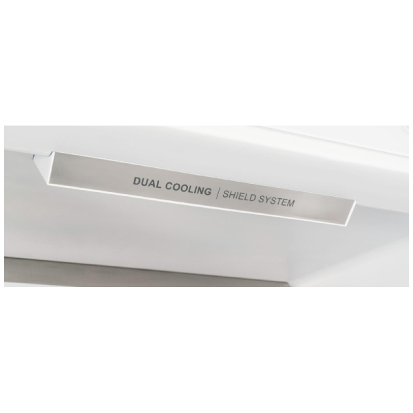 The Dual Cooling Shield System features automatic defrosting for both evaporators, ensuring optimized food storage conditions. The freezer compartment boasts two metal drawers and an automatic ice maker, enhancing convenience and storage efficiency.