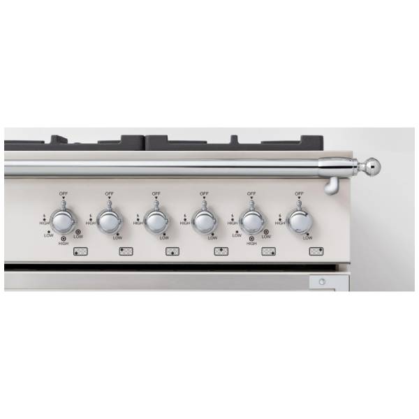 At the heart of this range is the high-efficiency maintop featuring six brass burners. These include two powerful dual-ring 19,000 BTU burners, capable of bringing water to a boil in under six minutes, alongside four versatile MonoBloc burners for a variety of cooking techniques. Whether you're delicately simmering at 750 BTUs or searing at high heat, this range offers precision control. A removable cast-iron griddle is also included, adding versatility to your cooking experience.