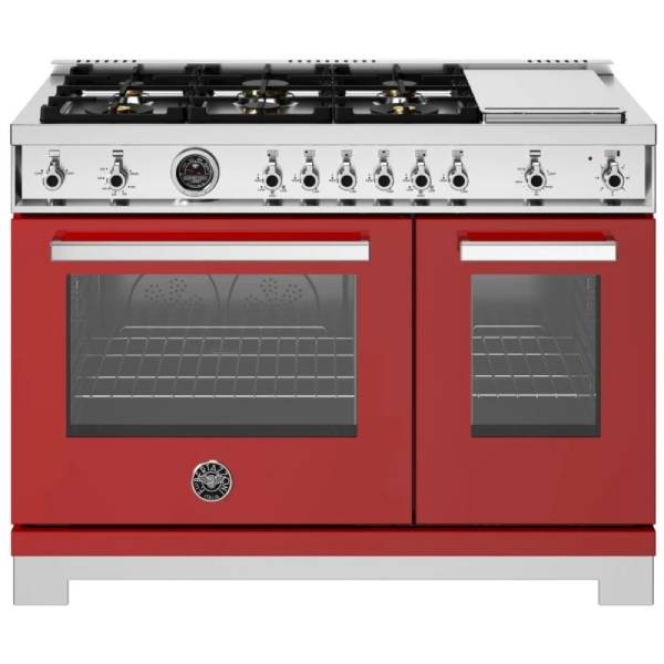 Bertazzoni PRO486BTFGMROT Gas Range, 48 inch Exterior Width, Convection, 6 Burners, 7.0 cu. ft. Capacity, 1 Ovens, Rosso colour Soft Close Door, Dual Convection, Telescopic Gliding Extension Rack, Griddle, Temperature Probe, Infrared Broiler