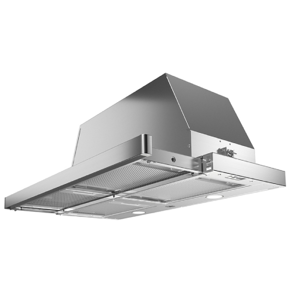 Featuring a robust 600 CFM motor and three power settings, this telescopic hood extends nearly 7 inches from the cabinet when in use, ensuring powerful ventilation and efficient removal of smoke and odors. The aluminum mesh filters are both removable and dishwasher safe, making maintenance effortless. Bright LED lights illuminate the cooking surface below, enhancing visibility and ensuring a well-lit cooking area.