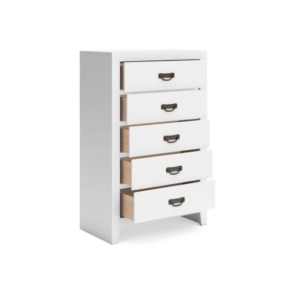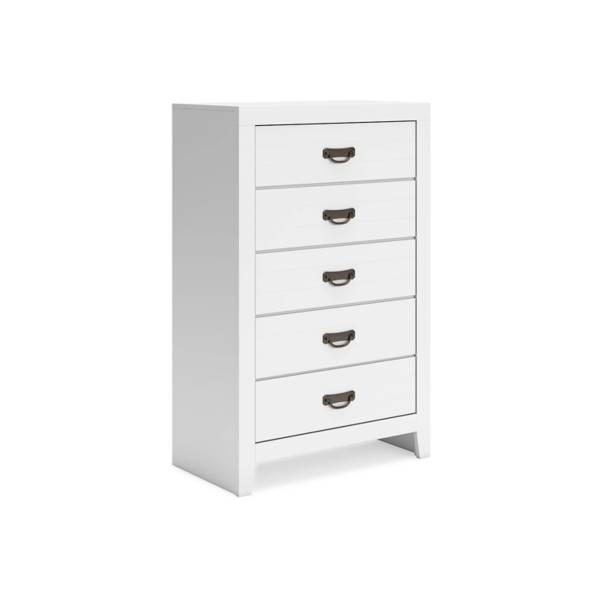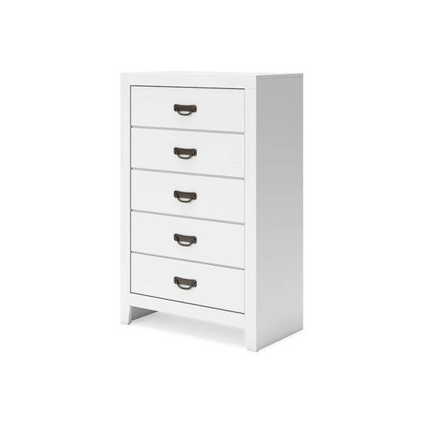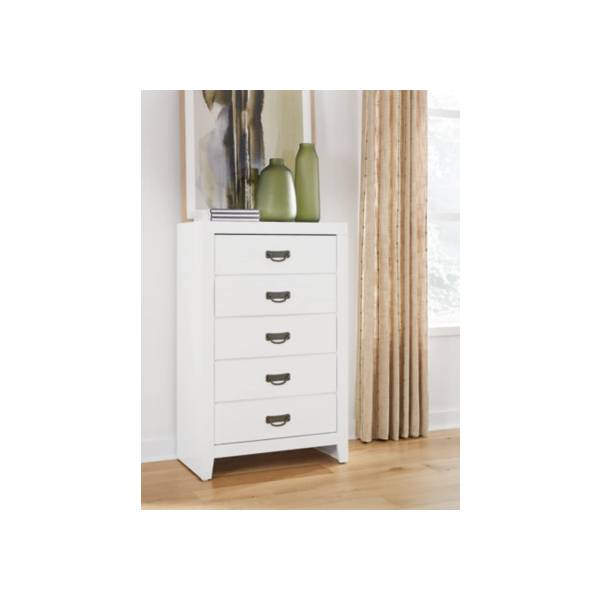 Embrace casual contemporary style with the Binterglen Five Drawer Chest, a perfect blend of simplicity and functionality. Its crisp white finish brings a refreshing and airy feel to any bedroom, effortlessly complementing a variety of décor styles. Designed with clean lines and a timeless aesthetic, this chest offers both versatility and elegance.