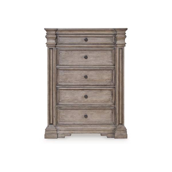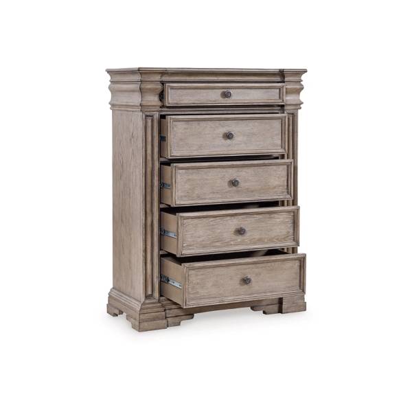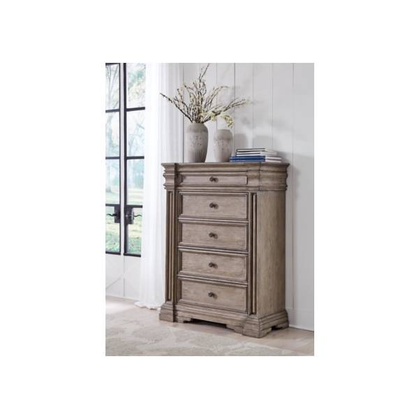 The Blairhurst Five Drawer Chest presents a beautifully crafted fusion of traditional design and modern functionality, offering an exceptional piece for your bedroom. Its striking silhouette features classic-inspired columns and breakfront pilasters that exude a casual traditional charm. The light, warm grayish brown glazed wood finish adds a relaxed, inviting feel, making it a versatile addition to any décor. The top of the chest is finished with an inlaid ash veneer border, further enhancing its elegant appeal.