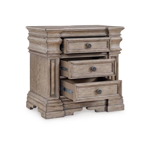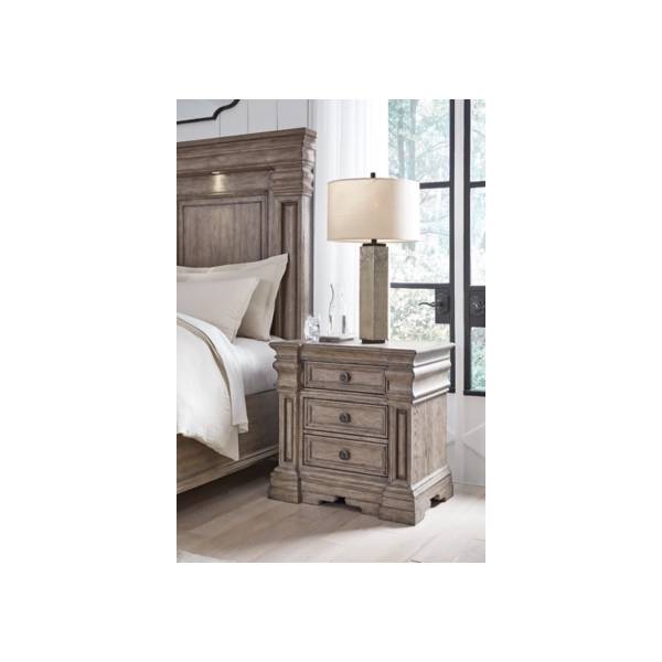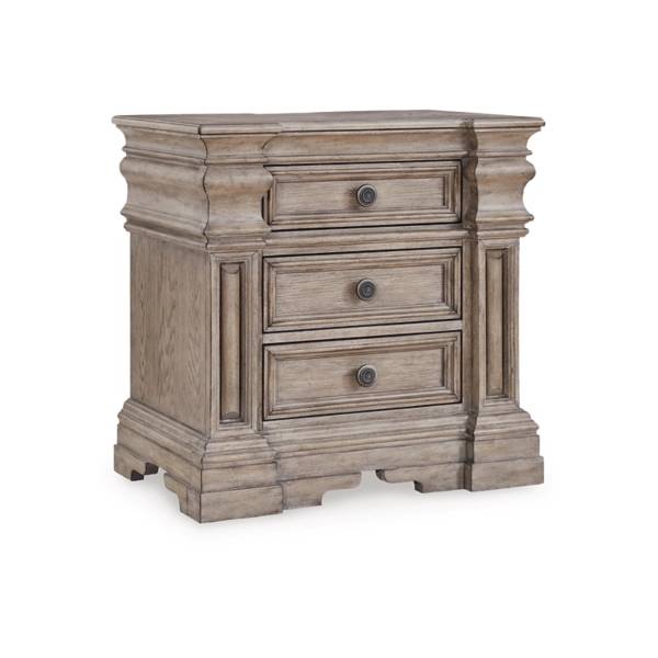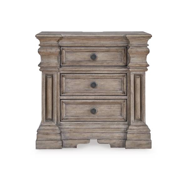 Elevate your bedroom with the refined presence of the Blairhurst Three Drawer Nightstand, available exclusively at Teletime. Designed to blend classic elegance with casual sophistication, this nightstand features a stately silhouette highlighted by timeless columns and beautifully crafted breakfront pilasters. The warm grayish brown glazed wood finish exudes a relaxed charm, while the inlaid ash veneer border on the top adds an extra layer of artisanal detail.