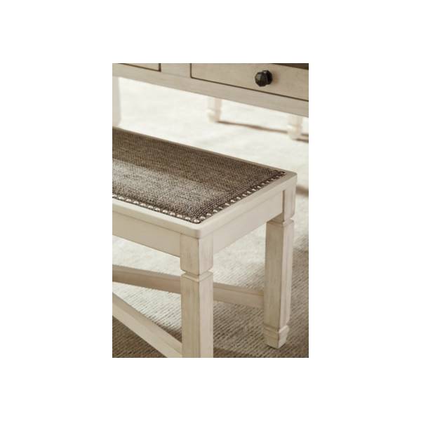 Elevate your dining experience with this beautifully crafted upholstered dining bench. Designed to impress, it features a generously cushioned seat covered in heavy woven fabric that perfectly complements its antiqued white finish. Constructed from veneers, wood, and engineered wood, this bench combines durability with rustic charm. Ideal for adding both comfort and style to your dining space, it invites you to savor every meal in elegance. Assembly required.