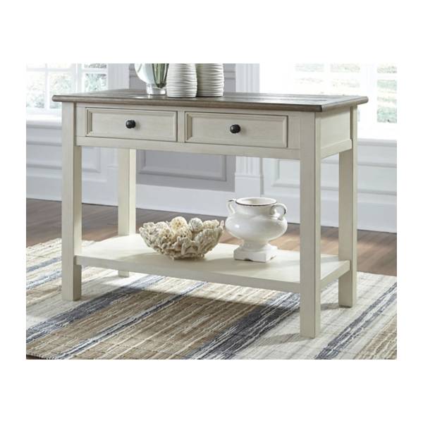 Crafted with attention to detail, the Bolanburg Sofa Table is made of veneers, wood, and engineered wood for durability and longevity. The two-tone finish—a combination of a weathered oak-tone top and an antiqued white base—exudes elegance and character. Its sturdy construction ensures it can effortlessly support decorative items, books, or other essentials.