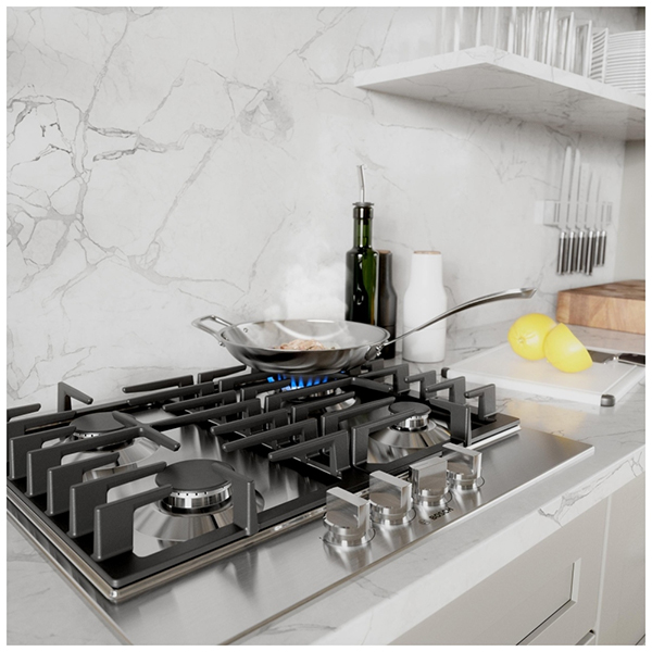 The continuous cast iron grates provide a stable cooking surface, allowing you to easily slide pans from one burner to another without the need to lift them. This cooktop's heavy-duty stainless-look metal knobs not only add a touch of elegance but also provide a premium, tactile experience that complements the robust design.