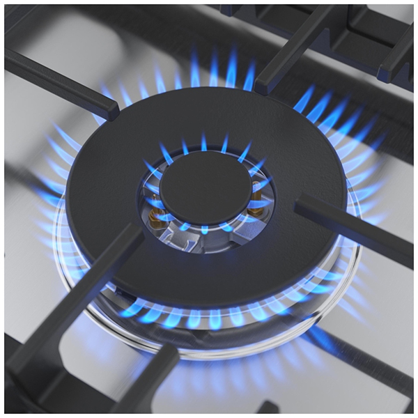 The Bosch 800 Series NGM8658UC also boasts a control knob with a red LED light line, providing a clear indication when a burner is on and displaying residual heat for added safety. The dual-flame power burner allows for seamless transitions between low and high heat, making it easy to handle a wide range of cooking tasks.