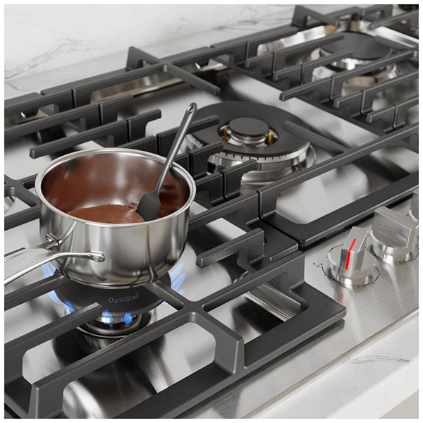 Cleaning up is a breeze with dishwasher-safe grates and a porcelain-enameled cooking surface, ensuring that your cooktop stays pristine with minimal effort. Additionally, the OptiSim® Burner is perfect for gentle simmering and melting, preventing scorching and maintaining the cooktop's sleek appearance.