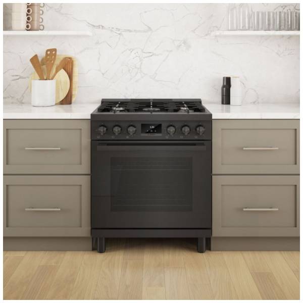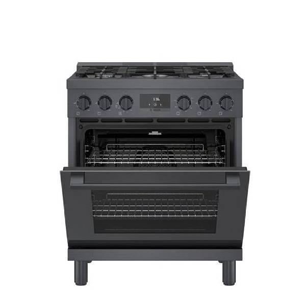 Bosch 800 Series HGS8045UC Gas Range, featuring a sleek and sophisticated 30-inch exterior width, offers top-tier performance with convection cooking, 5 burners, and a spacious 3.7 cu. ft. oven capacity. Its bold Black Stainless Steel finish elevates any kitchen space with modern elegance.