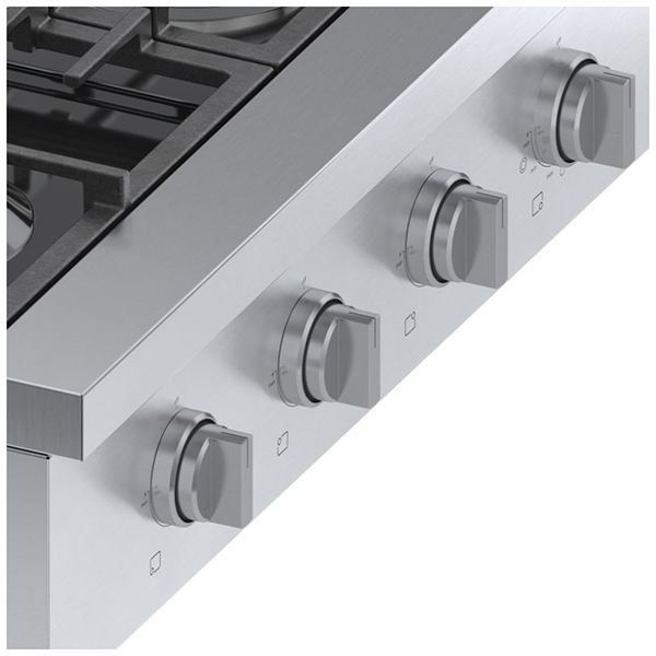 The bold, professional knob design adds a sophisticated touch while providing ergonomic control over the burners. These knobs are crafted for precision and durability, offering a tactile and visually appealing experience that complements the rangetop’s high-end aesthetic.