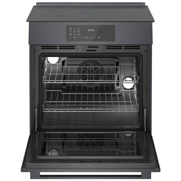 Introducing the Bosch 800 Series HII8047C Induction Range: 30-inch Exterior Width, Self-Clean, Convection, 4 Burners, 4.6 cu. ft. Capacity, Warming Drawer, 1 Oven, Black Stainless Steel, True European Convection, Temperature Probe.