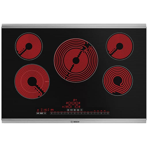 Bosch Benchmark Series NETP069SUC Electric Cooktop, 30 inch Exterior Width, 5 Burners, Stainless Steel colour Ceramic Surface, Dual Elements, AutoChef®, Automatic Shut-Off, PreciseSelect®
