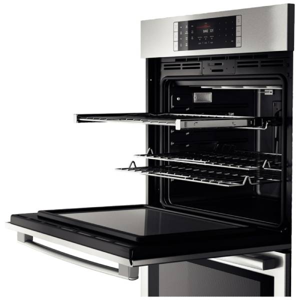Bosch Benchmark Series HBLP651UC Double Wall Oven, 30 inch Exterior Width, Both Ovens Convection, Both Ovens Self Clean, 9.2 cu. ft. Capacity, Temperature Probe, Stainless Steel colour True European Convection; Telescopic Gliding Extension Rack