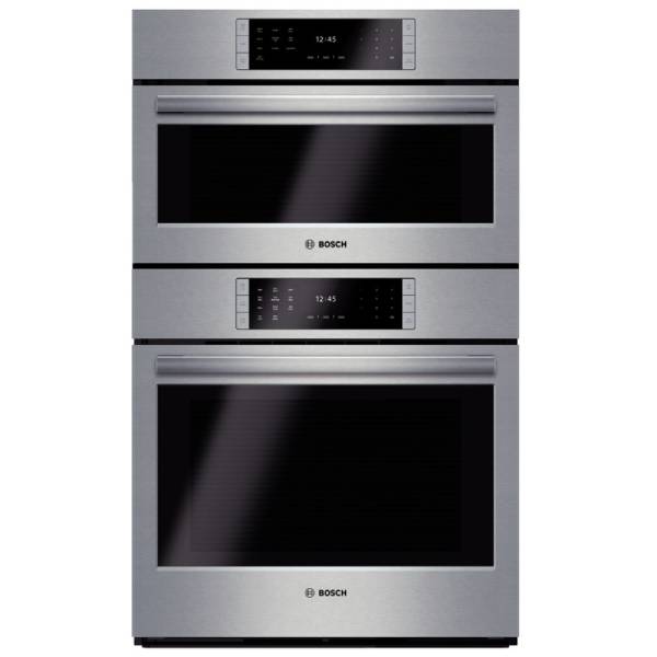 Bosch Benchmark Series HSLP751UC Steam Oven, 30 inch Exterior Width, Both Ovens Convection, One Oven Self Clean, 6.2 cu. ft. Capacity, Temperature Probe, Stainless Steel colour True European Convection, Telescopic Gliding Extension Rack