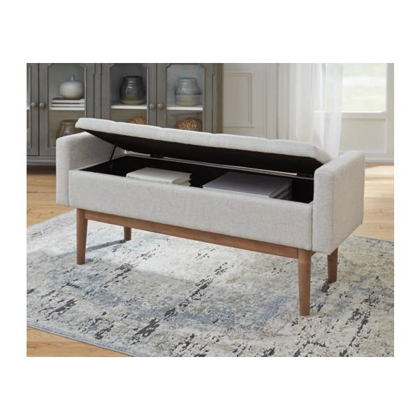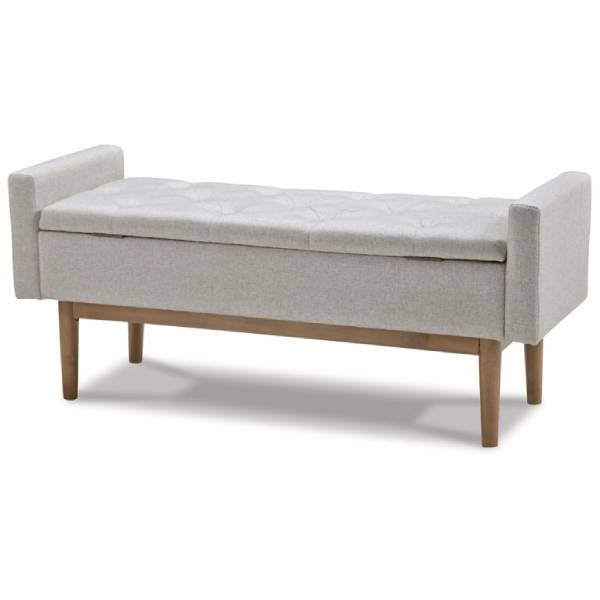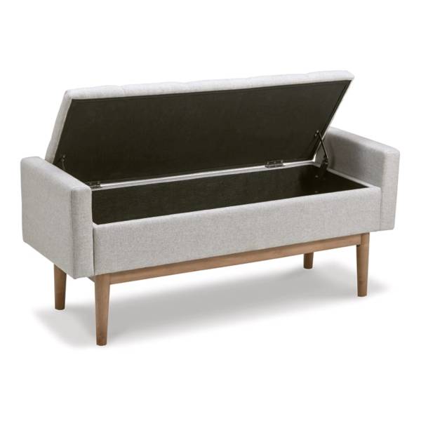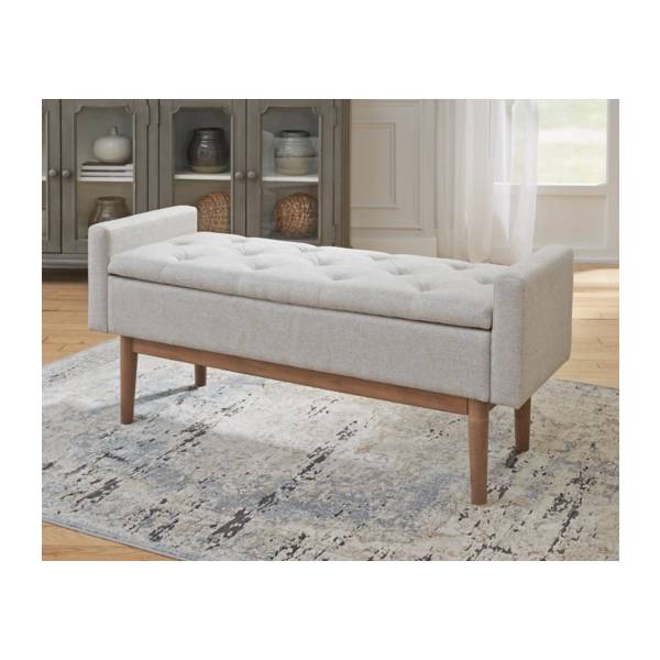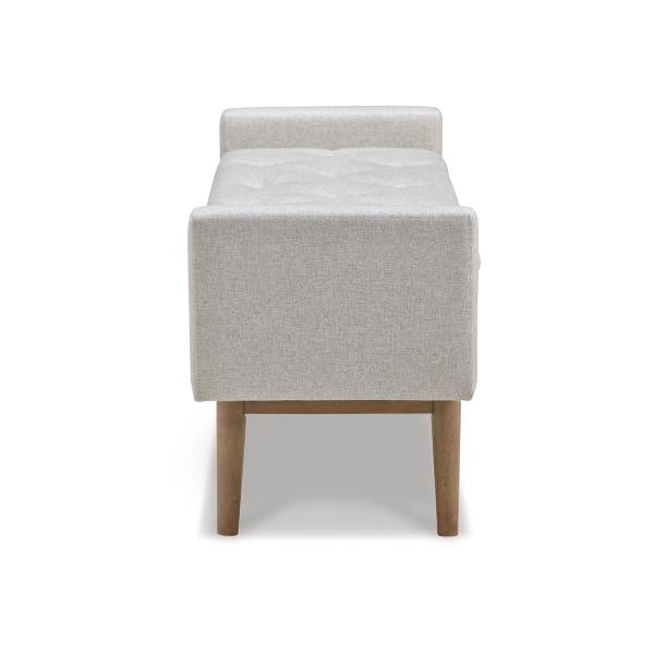 Embrace modern practicality with this stylish storage bench. Featuring a tufted beige seat cushion, this bench blends contemporary design with functionality. The hinged seat opens to reveal a convenient storage compartment, perfect for keeping items neatly tucked away. The bench's raised edges give the seat a subtle armrest effect, enhancing comfort and visual appeal. Supported by light brown wood legs, it seamlessly integrates with various modern interiors. Made of durable polyester and wood, this bench combines form and function, with assembly required for easy setup.