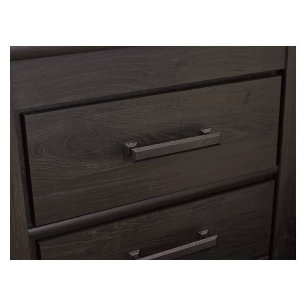The Brinxton Five Drawer Chest features a dark charcoal finish over replicated oak grain, offering urban sophistication with a relaxed air. Its five smooth-gliding drawers, accented with linear pulls in a dark pewter-tone finish, provide ample storage space. Constructed from engineered wood and decorative laminate, it ensures both durability and affordability.