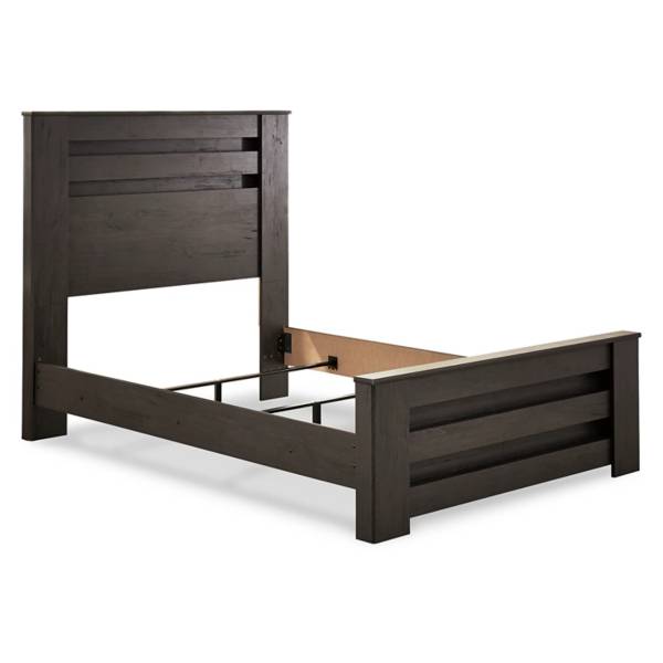 The Brinxton Full Panel Headboard is a statement piece that brings urban sophistication with a touch of warmth to your bedroom. Designed with crisp, clean lines, this headboard embodies a contemporary aesthetic while embracing subtle rustic elements. The deep horizontal grooves add a sense of dimension, creating an eye-catching visual appeal. The charcoal gray finish, enriched by a replicated oak grain effect, infuses warmth and character, making it a perfect fit for modern and industrial-style interiors.