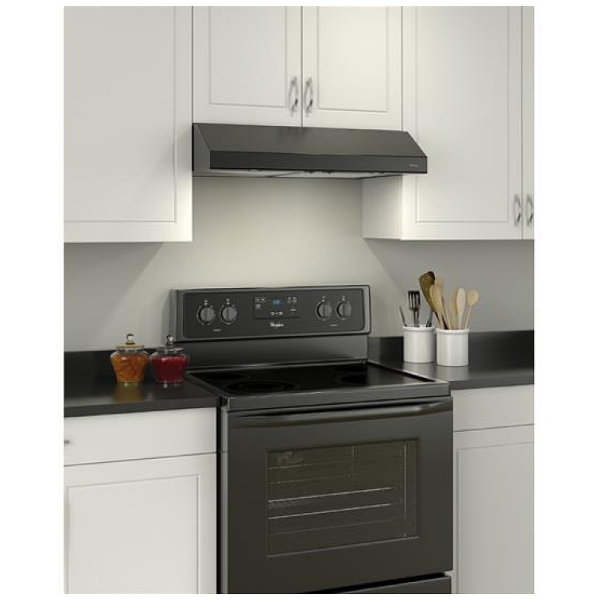 Broan BCS330BLC Range Hood, 30 inch Exterior Width, Under-Cabinet, 300 CFM, Outside / Ducting, Halogen , Dishwasher Safe Filters, Aluminum Mesh, Black colour Blower Included