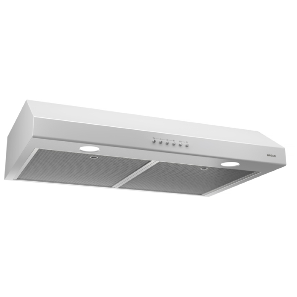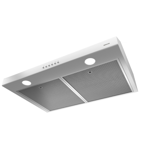 Broan BCSM130WH Range Hood, 30 inch Exterior Width, Under-Cabinet, Under-Cabinet, 375 CFM, Outside / Ducting, LED, Dishwasher Safe Filters, Aluminum Mesh, White colour Blower Included