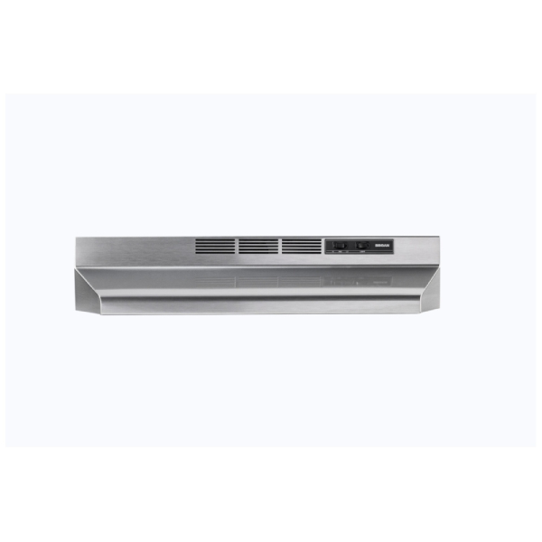 Enhance your kitchen with the Broan BU2 Series 30-inch Under-Cabinet Range Hood, now available in a sleek stainless-steel finish that is as functional as it is stylish. Designed by the leaders in residential indoor air quality, this range hood offers powerful ventilation without the premium price tag. With a 210 CFM MAX blower and HVI certification, it surpasses over-the-range microwaves in effectively removing smoke, odors, and pollutants, ensuring a cleaner and healthier kitchen environment. Operating at just 3.5 sones on normal speed, it maintains a quiet atmosphere, no louder than a casual conversation.