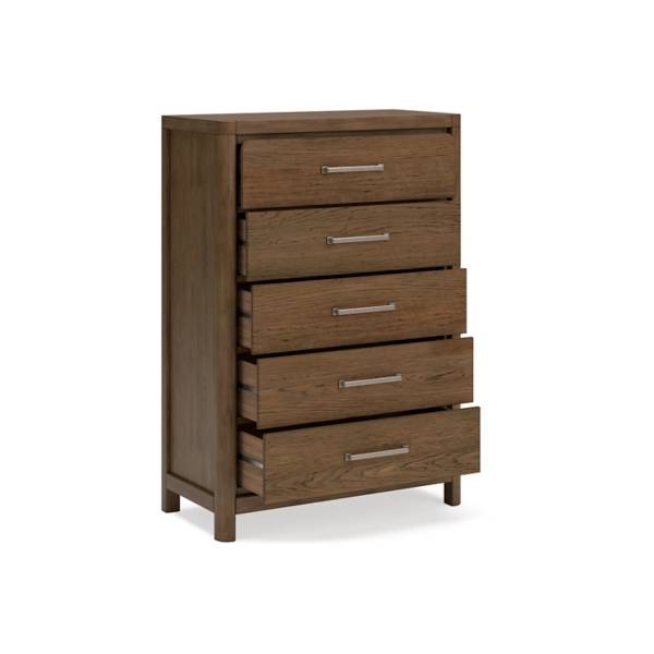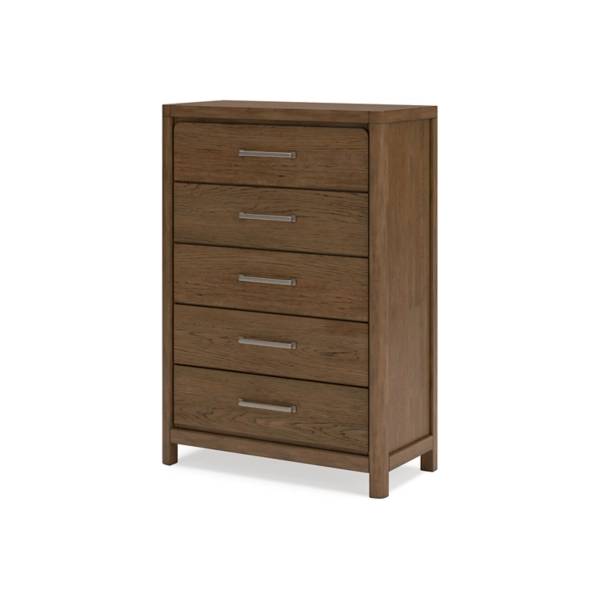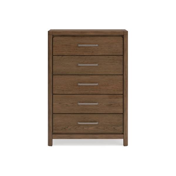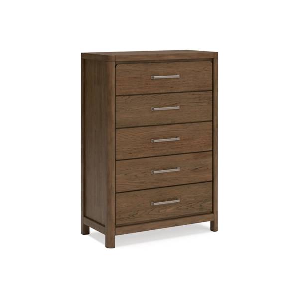 The Cabalynn Five Drawer Chest brings a perfect balance of contemporary design and rustic charm to your bedroom space. Crafted with meticulous attention to detail, it features a rich, multi-tonal wood finish that exudes warmth and sophistication. The clean, straight lines of the silhouette are accentuated by dark bronze-tone metal hardware, adding a sleek touch to the overall design.