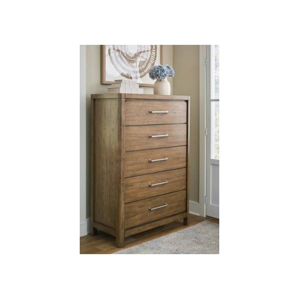 The textured wood grain finish adds a natural, organic element to the design, while the sturdy construction ensures stability and durability. Whether you’re curating a cozy rustic retreat or updating a modern bedroom, the Cabalynn Five Drawer Chest brings both style and functionality to your space. Its refined yet relaxed aesthetic makes it an ideal choice for those seeking a versatile and elegant storage solution that complements a wide range of interior designs.