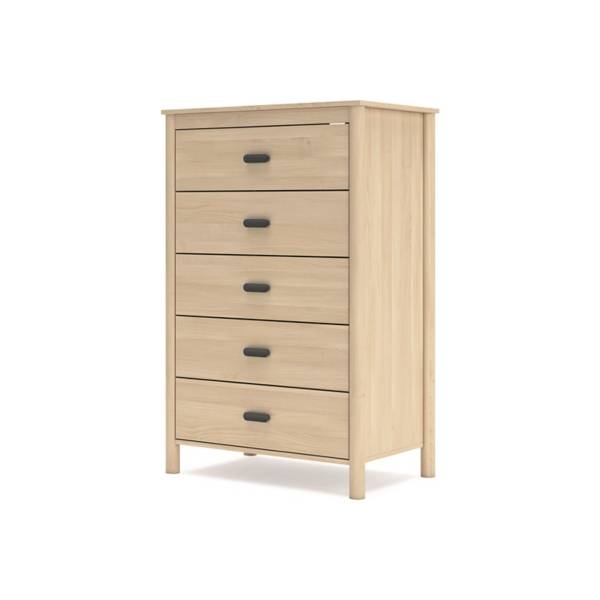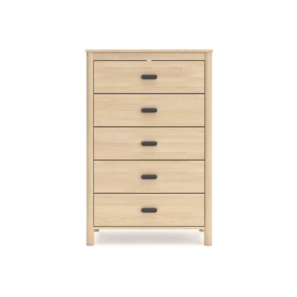 Crafted with durable engineered wood and decorative laminate, it delivers long-lasting quality at an affordable value. The natural ash wood grain finish brings an authentic, organic touch that enhances the relaxed vibe of your room. Five smooth-gliding drawers with vinyl-wrapped sides and backs ensure durability while providing ample storage for your wardrobe.
