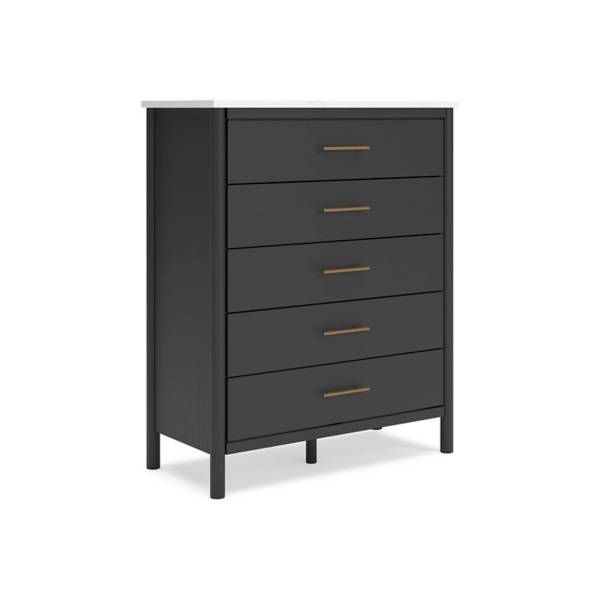 The Cadmori Five Drawer Wide Chest features a matte black finish with a replicated white marble top, exuding a minimal and sophisticated boho style. Its five smooth-gliding drawers, accented with champagne-colored handles, provide ample storage space. Constructed from engineered wood and decorative laminate, it ensures both durability and affordability.