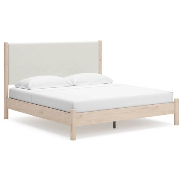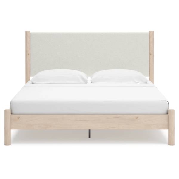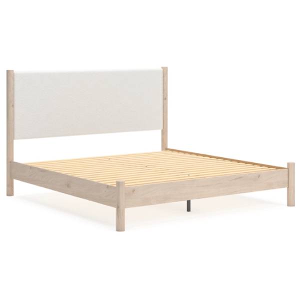 The king upholstered panel bed features a striking headboard and footboard, both accented by round post legs that add a subtle, organic feel. Constructed with engineered wood, including MDF, particleboard, and plywood, it offers the perfect combination of affordability and durability, making it an enduring addition to your bedroom. The bed's smooth, light finish with a replicated oak grain enhances its aesthetic, bringing warmth to the minimalist design while complementing the soft, textured polyester upholstery that graces the headboard.